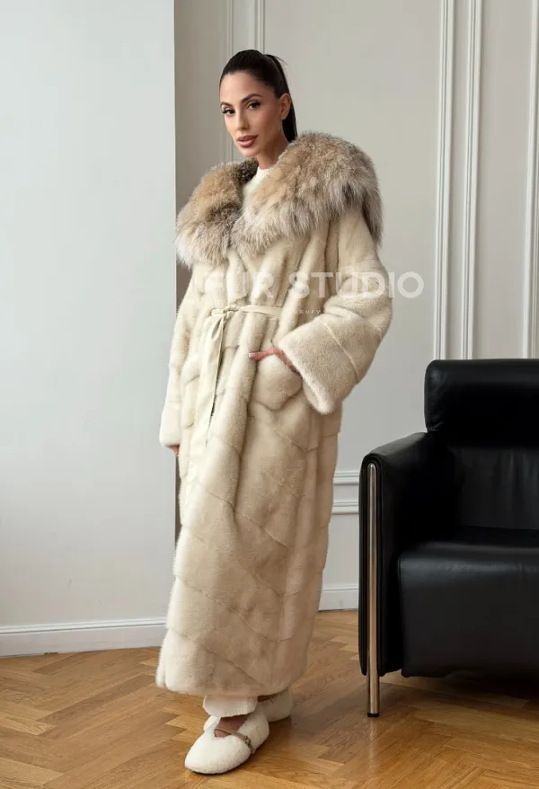 Мех данной шубы аукционная норка, цвет бежевый. Предлагается в размерах от 42 до 52. Длина модели 125-130 см, что выгодно подчеркивает фигуру девушек. Эта модель идеально подойдет для девушек и женщин, предпочитающих роскошные натуральные меха.