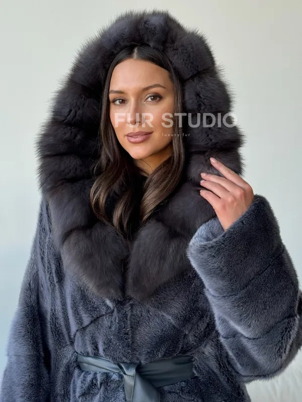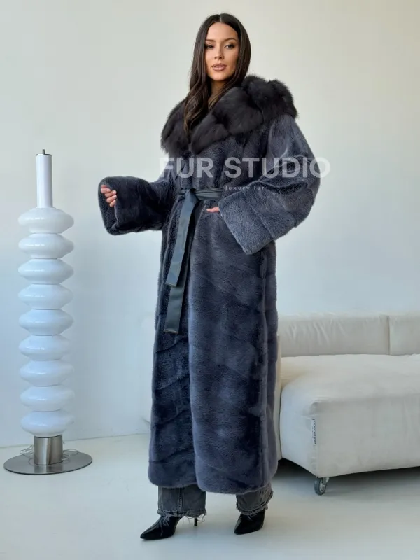 Длинная норковая шуба с куницей капюшон 102500