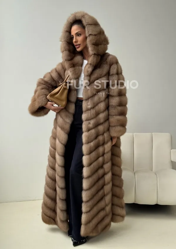 Длинная шуба из меха куницы с капюшоном 102435