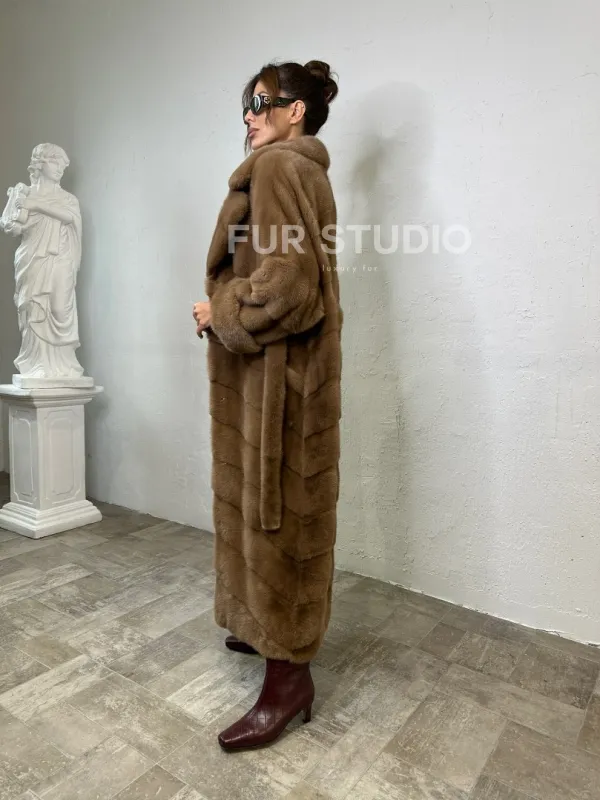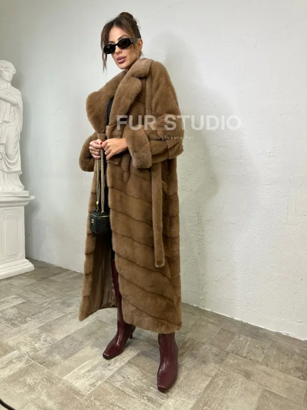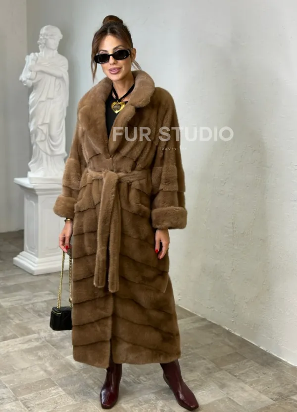 Мех данной шубы аукционная норка , цвет бежевый. Предлагается в размерах от 40 до 50. Длина модели 125-130 см, что выгодно подчеркивает фигуру девушек. Эта модель идеально подойдет для девушек и женщин, предпочитающих роскошные натуральные меха.