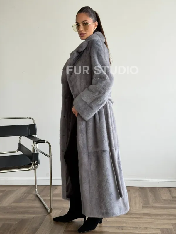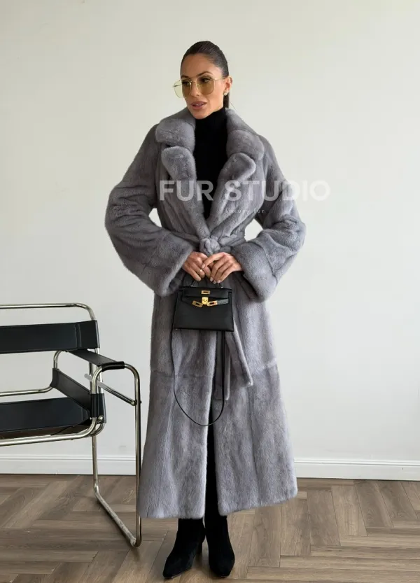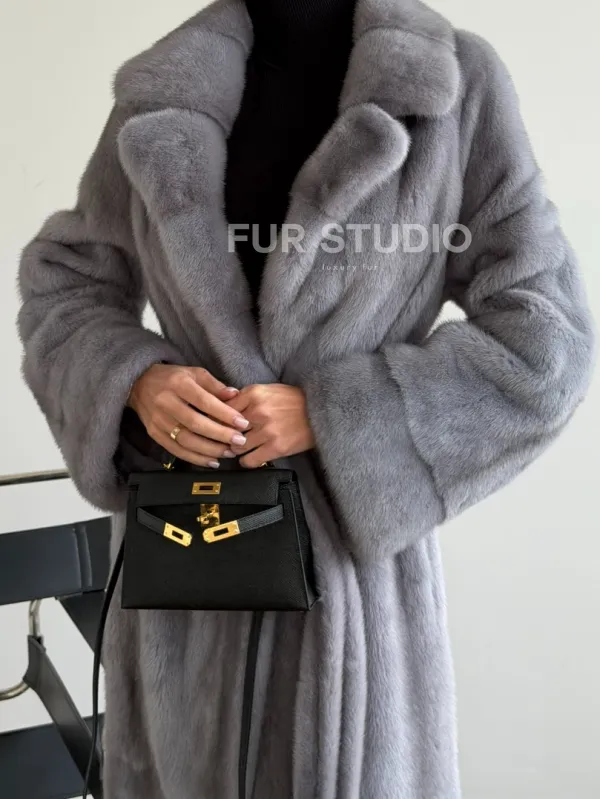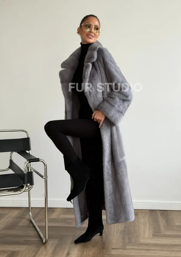 Мех данной шубы аукционная норка, цвет голубой. Предлагается в размерах от 42 до 50. Длина модели 120-125 см, что выгодно подчеркивает фигуру девушек. Эта модель идеально подойдет для девушек и женщин, предпочитающих роскошные натуральные меха.