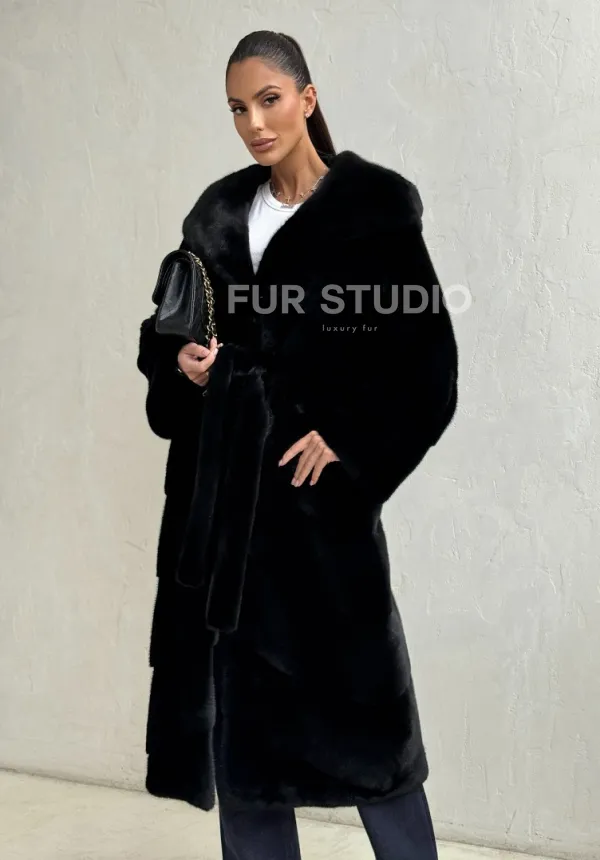 Мех данной шубы норка Blackglama , цвет черный. Предлагается в размерах от 42 до 50. Длина модели 115-120 см, что выгодно подчеркивает фигуру девушек. Эта модель идеально подойдет для девушек и женщин, предпочитающих роскошные натуральные меха.