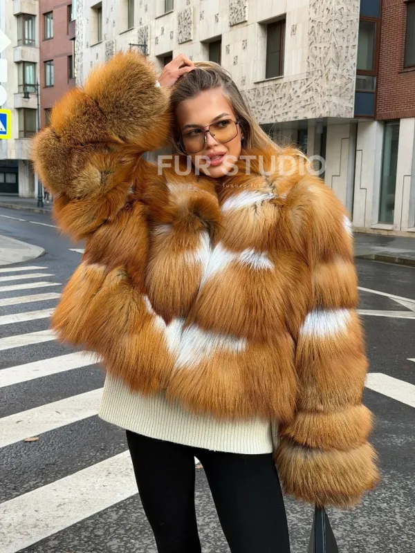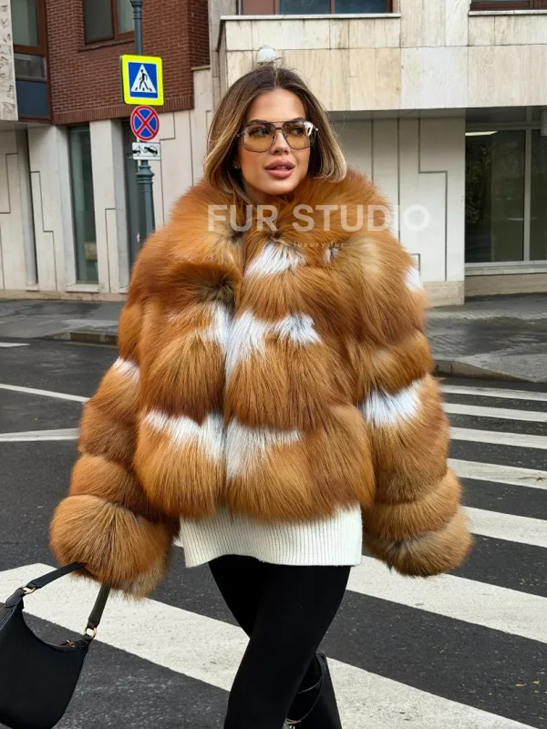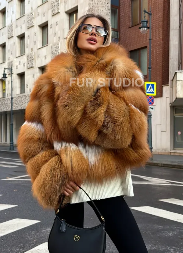 Мех данной шубы лиса, цвет рыжий. Предлагается в размерах от 42 до 46. Длина модели 50-55 см, что выгодно подчеркивает фигуру девушек. Эта модель идеально подойдет для девушек и женщин, предпочитающих роскошные натуральные меха.
