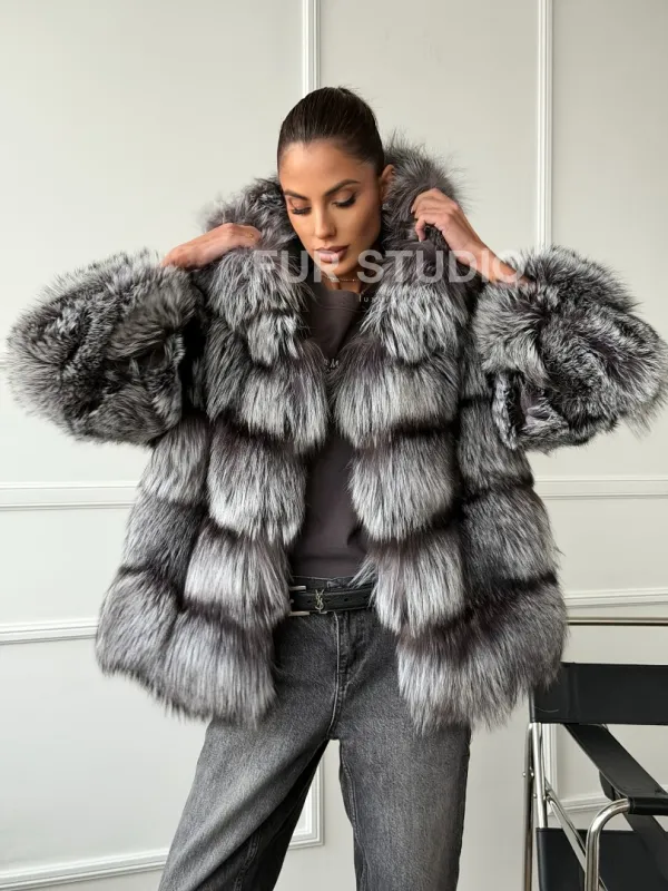 Мех данной шубы лиса, цвет серый. Предлагается в размерах от 42 до 48. Длина модели 60-65 см, что выгодно подчеркивает фигуру девушек. Эта модель идеально подойдет для девушек и женщин, предпочитающих роскошные натуральные меха.