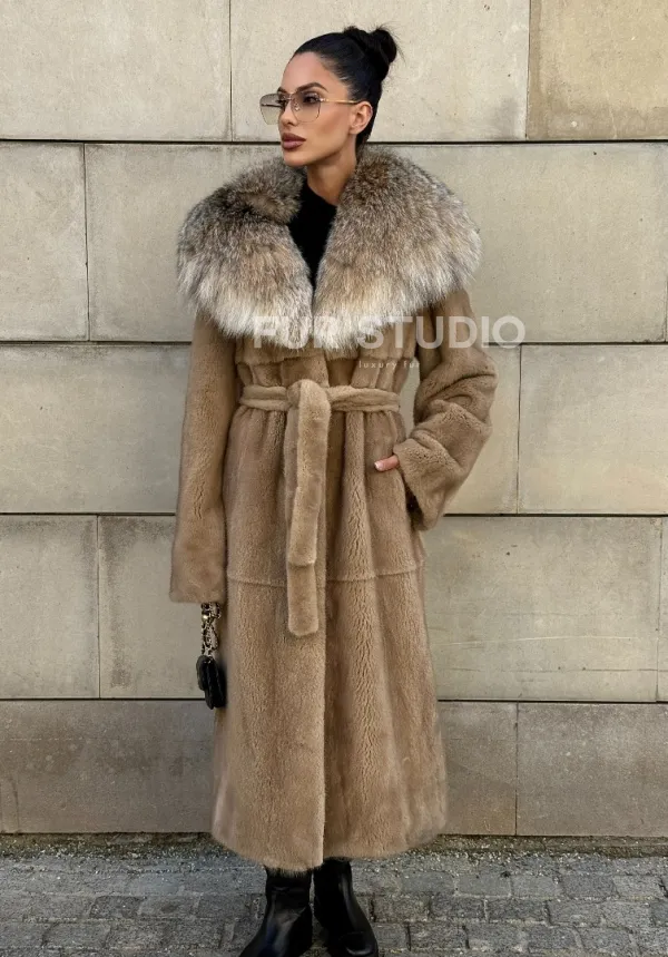 Мех данной шубы аукционная норка, цвет бежевый. Предлагается в размерах от 42 до 50. Длина модели 115-120 см, что выгодно подчеркивает фигуру девушек. Эта модель идеально подойдет для девушек и женщин, предпочитающих роскошные натуральные меха.