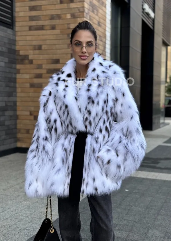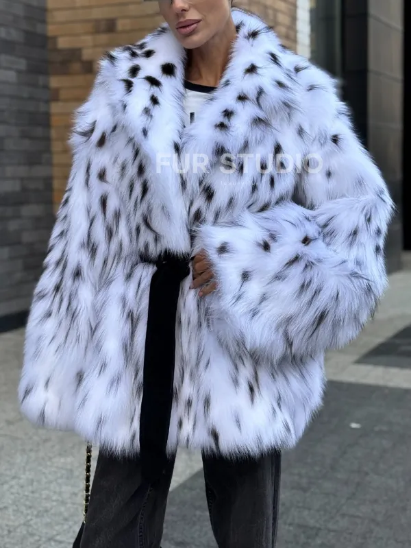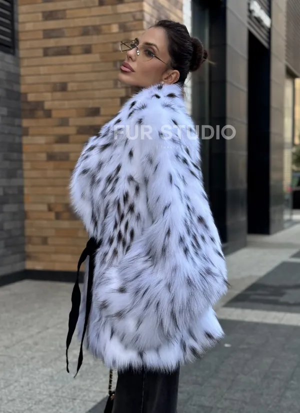 Шуба - Белая лиса с вшитыми пятнами из рыси PREMIUM качество, фасон «летучая мышь» легкая и стильная, созданная специально для уверенной в сете активной роскошной женщины. Даже в длине до середины бедра шуба из лисы подарит уют и тепло в любую погоду: в ней комфортно прогуливаться в морозные и ветреные дни, причем не только от такси до ресторана.