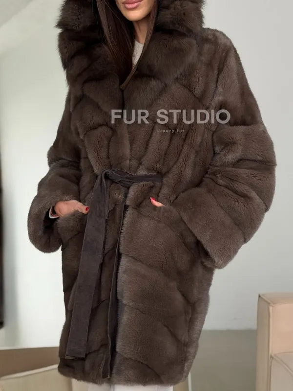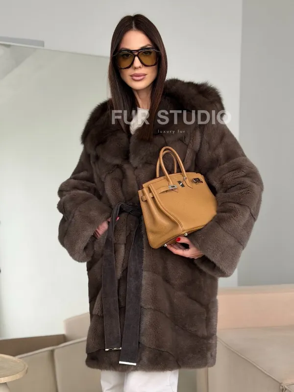 Шуба норковая с капюшоном из куницы 102786