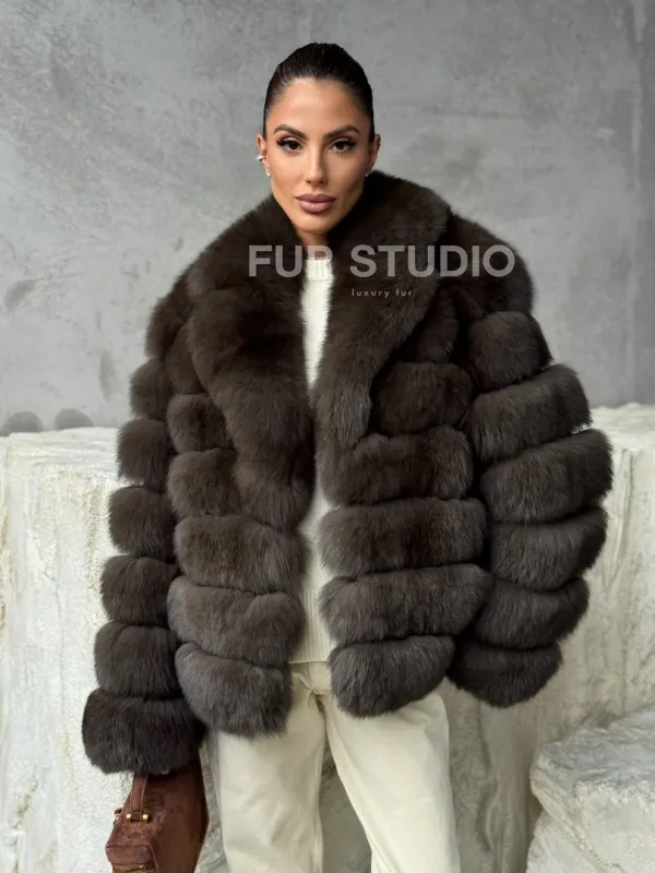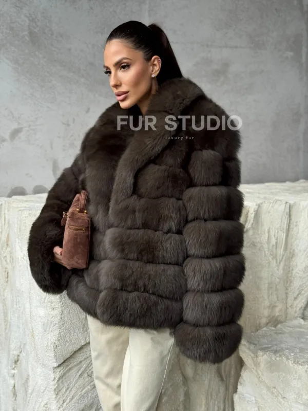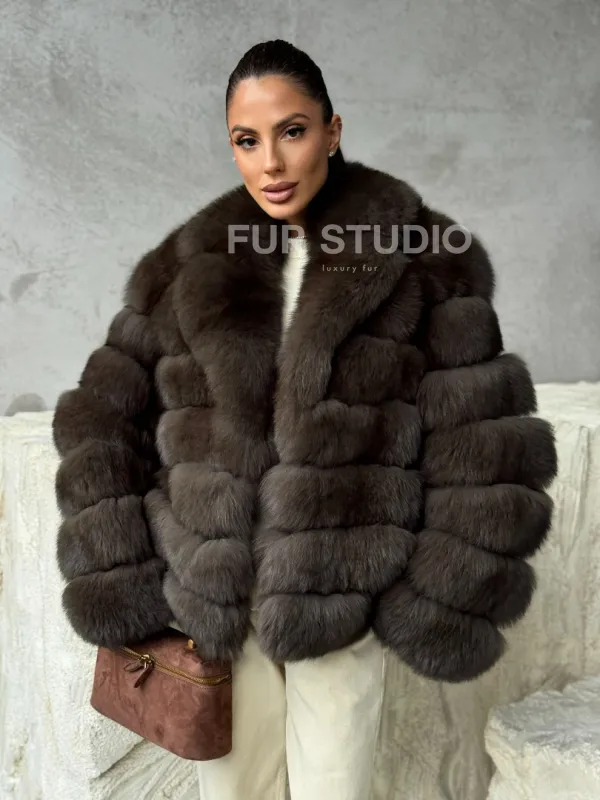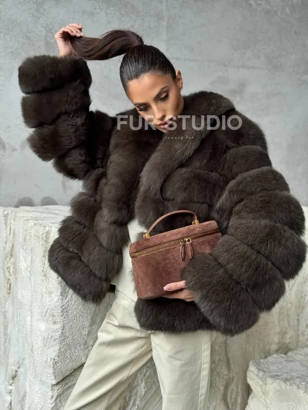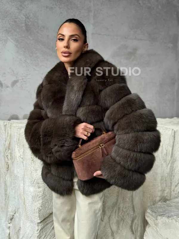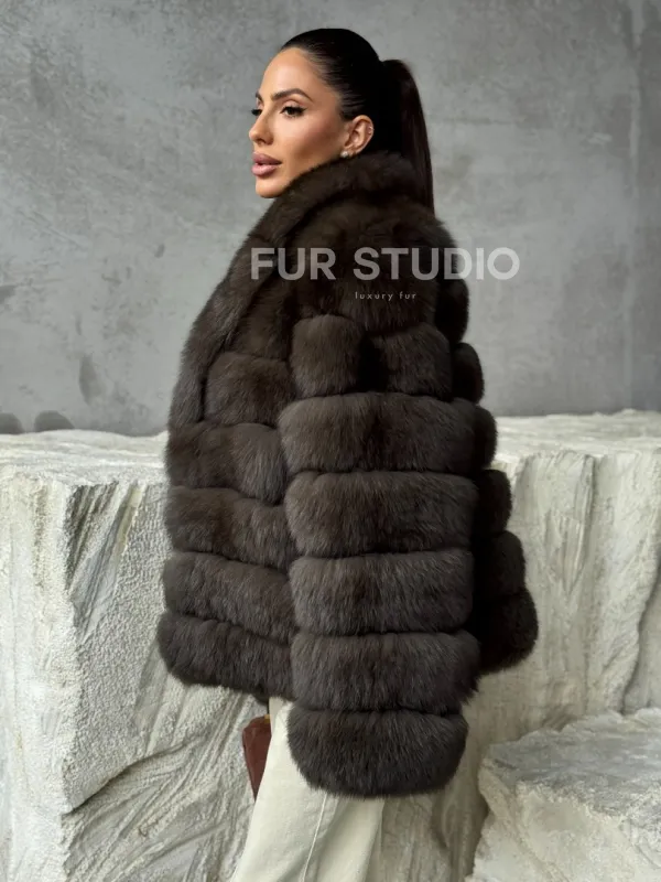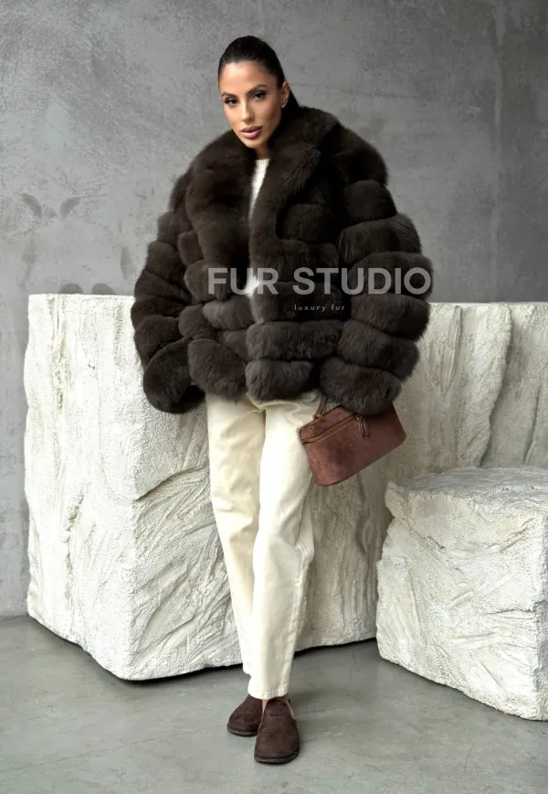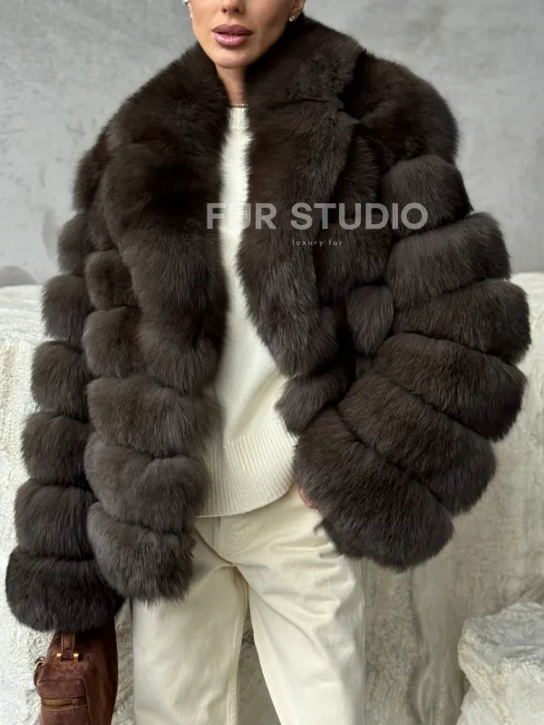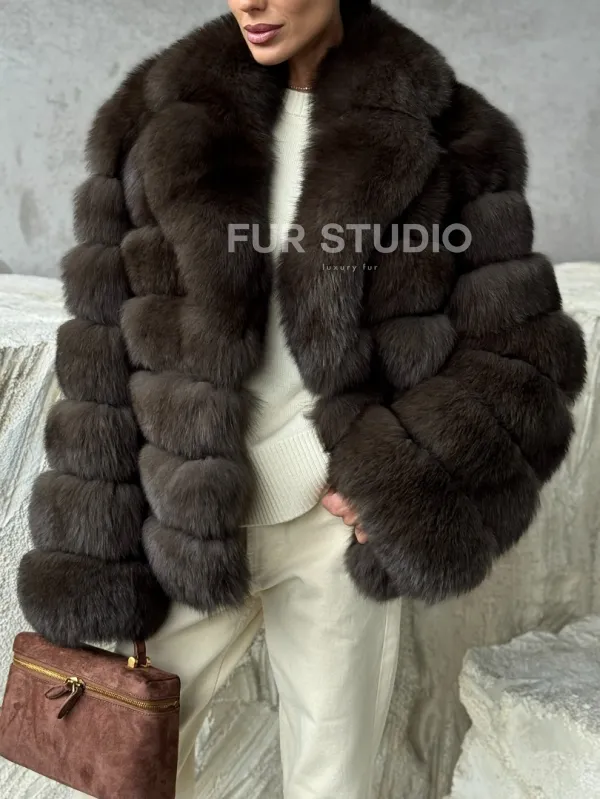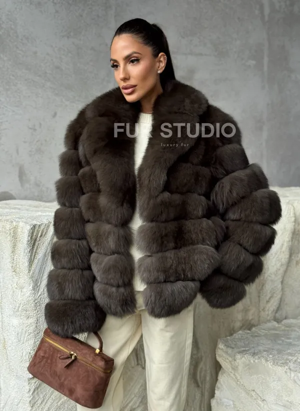 Мех данной шубы финский песец, цвет коричневый. Предлагается в размерах от 42 до 48. Длина модели 55-60 см, что выгодно подчеркивает фигуру девушек. Эта модель идеально подойдет для девушек и женщин, предпочитающих роскошные натуральные меха.