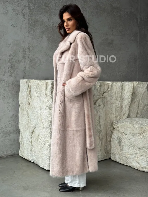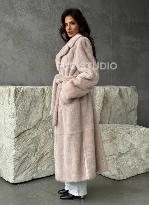 Мех данной шубы аукционная норка , цвет бежевый. Предлагается в размерах от 42 до 50. Длина модели 125-130 см, что выгодно подчеркивает фигуру девушек. Эта модель идеально подойдет для девушек и женщин, предпочитающих роскошные натуральные меха.